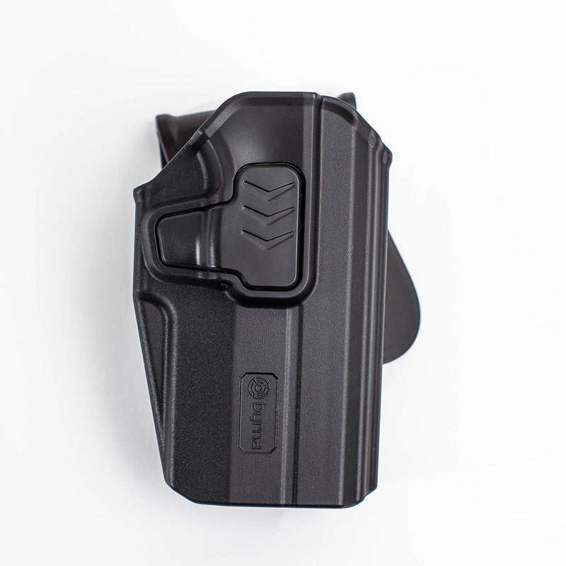 RETENTION DEVICE: The Level II Holster features a built in retention device that uses the launcher trigger guard to secure your Byrna in the holster. Simply depress the button to draw safely and securely.